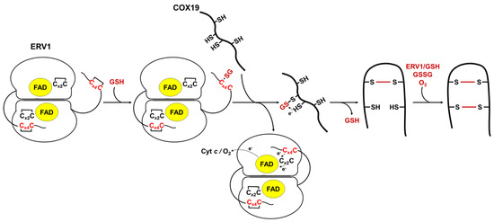 Proposed model of GSH- and AtERV1-mediated oxidation of Arabidopsis COX19 in the absence of MIA40. In this scheme, reduced glutathione (GSH) reacts with the shuttle disulfide of ERV1 (Cx4C) (rather than the catalytic disulfide, which is not in contact with the substrates), leading to the formation of a glutathione adduct on one of these cysteines. The glutathione molecule would then be transferred to one of the cysteine residues, forming the more internal disulfide in the substrates, to promote disulfide bond formation and the release of GSH. The second disulfide bridge of the substrate could be formed using the same mechanism (ERV1 + GSH) or, eventually, by the action of GSSG or of O2 in conjunction with metal traces. The shuttle disulfide of ERV1 is subsequently regenerated by transferring electrons to the catalytic Cx2C motif, FAD and oxygen (O2) or cytochrome c (cyt c).
