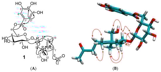 Compound 1 was isolated as a colorless gummy solid, and its molecular formula, C26H36O12, was established from the HRESIMS molecular ion peak at m/z 563.2072 [M + Na]+ (calculated for C26H36O12Na, 563.2099) and m/z 539.2128 [M − H]− (calculated for C26H35O12, 539.2134), as well as the 13C NMR data (Table 1). The 1H NMR spectrum of 1 (Figures S3–S5) displayed spectroscopic features typical of a galloyl moiety []; an aromatic 2H singlet (δH 7.13, H-2″/H-6″) that exhibits HSQC correlation with a non-oxygenated aromatic carbon (δC 109.6, 2C, C-2″/C-6″) and HMBC correlations with oxygenated aromatic carbon (δC 146, 2C, C-3″/C-5″, and δC 137.7, C-4″), a quaternary aromatic carbon (δC 120.5, C-1″), and a carbonyl carbon (δC 167.2, C-7″). The 1H NMR and 1H–1H COSY spectra of 1 (Table 1, Figures S6–S8) exhibited a resonating system of seven aliphatic proton spins at δH 4.49–3.19 (Table 1), with a large coupling pattern of the glucose H-2′–H-5′ (JH-1′–H-2′ = 7.8, JH-2′–H-3′ = JH-3′–H-4 = JH-4′–H-5′ = 9.6 Hz), highlighting the 4C1 conformation of the glucopyranose moiety []. A large coupling constant of the glucose H-1′ proton signal (δH 4.49, J = 7.8 Hz) indicates the β-configuration of the glucose’s anomeric center []. The HSQC correlations of the glucose proton signals (Figure S10) enabled the assignments of the 13C chemical shifts (δC 102.2, 74.5, 77.5, 71.3, 74.8, 64.8) to the glucose carbons C-1′–C-6′, respectively (Table 1). The 13C NMR spectrum of 1 (Figure S9) also exhibited a system of thirteen carbons (Table 1), characteristic of the megastigmane moiety []. Aided by the 1H–1H COSY and HSQC spectroscopic data, the system is separated into two components. The first is composed of nine carbons, recognized by their 1D NMR and the HSQC data: one oxygenated methine carbon δC 72.3 (C-3) (correlated in the HSQC spectrum to a 1H multiplet signal at δH 4.14 (H-3)), two non-oxygenated methylene carbons at δC 41.6 (C-2) (correlated in the HSQC spectrum to the H2-2 proton signals at δH 1.21 (1H, t, J = 8.4 Hz, H-2ax) and 2.25 (1H, ddd, J = 2.4, 5.4, 14.4 Hz, H-2eq) and at δC 39.2 (C-4) (correlated in the HSQC spectrum to the H2-4 proton signals at δH 1.94 (1H, br.dd, J = 9.6, 16.2 Hz, H-4ax) and δH 2.30 (1H, dd, J = 5.4, 16.2 Hz, H-4eq)), one oxygenated methylene carbon at δC 68.6 (C-12) (correlated in the HSQC spectrum to δH 3.39 and 3.28 (each 1H, d, J = 11 Hz)), two tetrasubstituted olefinic carbons at δC 128.8 (C-5) and 136.6 (C-6), and a quaternary carbon at δC 43.5 (C-1). The remaining two methyl carbons of this component appear at δC 24.3 and 19.8, and one of them is correlated in the HSQC with a 3H-singlet at an up-field shift of 0.91 (H3-11), and the other is correlated with the proton signal at a relatively low-field shift δH 1.54 (3H, brs, H3-11). The 1H chemical shift of the latter corresponds to the methyl group on an olefenic carbon, and the broadening of the signal is explained by the W-shaped 1H–1H coupling with the H-4 proton signal (δH 1.94, 1H, br.dd) []. The second component of the megastigmane moiety was found to be composed of a chain of four carbons: the 1D together with the 2D (1H–1H COSY, Figures S6–S8) and HSQC (Figures S10–S12) spectra substantiated the presence of two methylene groups (δH 2.14 and 2.2 (2H, dd, H2-7), correlated with a carbon signal at δC 22.3 (C-7) and δH 2.48 (2H, t, H2-8), correlated with a carbon signal at δC 44.2 (C-8)). The other two carbons were identified as methyl and ketone carbons: the methyl proton signal at δH 2.08 (3H, s, H3-10) exhibits an HSQC correlation with the carbon peak at δC 29.8 (C-10) and an HMBC correlation with a ketonic carbonyl carbon peak at δC 209.3. The same carbonyl carbon is also correlated with the H2-8 signal at δH 2.48 in the HMBC spectrum. This four-carbon segment, proposed as –CH2–CH2–CO–CH3, was placed at the olefenic carbon C-6 (δC 133.6), as deduced from the HMBC correlations of the H-7 signal at δH 2.14 with C-6 (δC 133.6) and the neighboring carbons C-1 (δC 43.5) and C-5 (δC 128.8). The connectivity of the structural components (galloyl, glucosyl, and megastigmane moieties) of 1 was then substantiated based on the HMBC correlations (Figures S13 and S14).