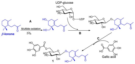 Except for the megastigmane aglycone β-ionone, this is the first report on the isolation of a megastigmane from henna. Megastigmanes are oxygenated isonorterpenoids with a C13 carbon skeleton and frequently referred to as oxidative by-products from β-carotenoids []. The biosynthesis of compound 1 from β-ionone and gallic acid is assumed to be as shown in Figure 3. This biotransformation involves the oxidation of C-3 and C-11 of the megastigmane basic skeleton (Step A), followed by the glucosylation (Step B) and esterification of the glucose OH-6 with gallic acid (Step C). Direct glycosylation of the megastigmane with a 6-O-galloyl glucose is also possible.
