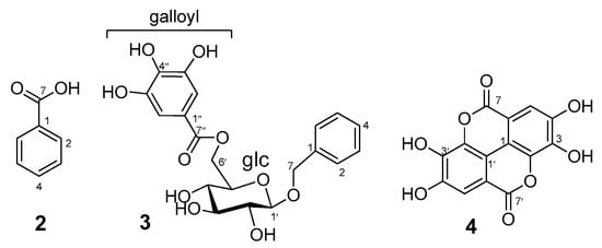 - Compound 3 was isolated as a white amorphous powder. Its 1H NMR spectrum (Figure S22) exhibited proton signals of a 1C4 β-D-glucopyranose core {δH 4.55 [1H, dd, J = 1.8, 12 Hz, glc H-6], 4.39 (1H, d, J = 8.4 Hz, glc H-1), 4.34 (1H, dd, J = 6.6, 12.6 Hz, glc H-6), 3.29 (1H, dd, J = 8, 9 Hz, glc H-2), 3.44 (1H, t, J = 9 Hz, glc H-3), 3.44 (1H, t, J = 9 Hz, glc H-4), and 3.57 (1H, ddd, J = 1.8, 6, 9 Hz, glc H-5)} [,,]. The spectrum also exhibited a 2H singlet at δH 7.13 (2H, s, galloyl H-2/H-6), which exhibited a HSQC correlation with the 2C peak at δC 109.7 (2C, galloyl C-2/C-6). These are characteristic of a galloyl moiety [,,]. The spectrum also exhibited a proton signal of a benzyl moiety at δH 7.33 (2H, dd, J = 1.2, 7.8 Hz, H-2/H-6), 7.26 (2H, dt, J = 1.2, 7.8 Hz, H-3/H-5), 7.20 (1H, dt, J = 1.2, 7.8 Hz, H-4), and 4.79, 4.59 (each 1H, d, J = 12 Hz, H-7). The 13C NMR spectrum (Figure S24) exhibited carbon peaks corresponding to the structural components of 2 (viz, benzyl, galloyl, and glucose). The HMBC correlations between the galloyl 2H singlet (δH 7.13) and the glucose H2-6 (δH 4.55 and 4.34) with the galloyl carbonyl carbon (δC 167.2) evidenced the placement of the galloyl moiety at C-6 of the glucose core. The HMBC correlations of the benzyl H2-7 at δH 4.79 and 4.59 (each 1H, d, J = 12 Hz) with the glucose anomeric carbon (δC 102.7), as well as the HMBC correlation of the glucose anomeric proton (δH 4.39) with the benzylic carbon C-7 (δC 70.9), indicated the placement of the benzyl moiety at the anomeric center of the glucose, as shown by the structural formula of 2 (Figure 4). The ESIMS negative ion peak at m/z 421 [M − H]− confirmed the identification of 2 as benzyl 6′-O-galloyl-β-D-glucopyranoside []. Compound 4 was isolated as a pale yellow amorphous powder. Its 1H NMR spectrum (Figure S27) exhibited a 2H singlet signal at δH 7.50 (H-2/H-2′) and a broad singlet at δH 10.69 (br. s, OH). The 13C NMR spectrum exhibited seven carbon peaks, each equivalent to two carbons [δC 159.5 (2C, C-7/C-7′), 148.5 (2C, C-4/C-4′), 140.0 (2C, C-2/C-2′), 136.8 (2C, C-3/C-3′), 112.7 (2C, C-6/C-6′), 110.6 (2C, C-5/C-5′), and 108.0 (2C, C-1/C-1′). These are characteristics for an ellagic acid. Based on the molecular ion peak at m/z 301 [M − H]− in the ESIMS spectrum, we confirmed the structure of 4 to be ellagic acid [].