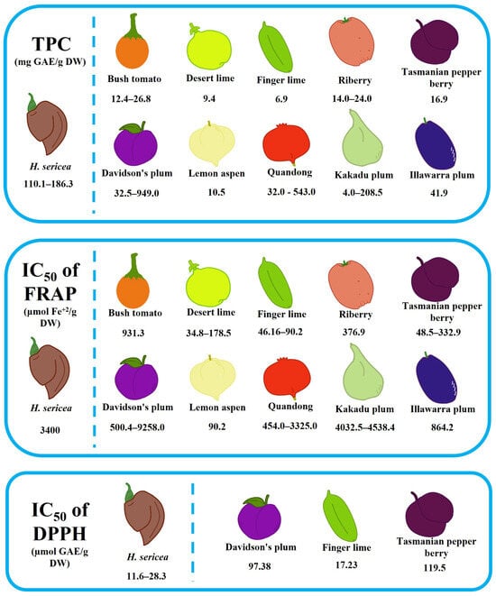 Fruits are an important source of nutrients and dietary energy, providing fibre, minerals, vitamins, and phytochemicals, and have been consumed for their nutritional and health value. Many fruits have proven their potential protective effects against different types of diseases, such as cardiovascular diseases, cancers, eye diseases, chronic diseases, and obesity [87,88]. Currently, over 25,000 plants have been found in Australia, of which around 2000 edible plants have been consumed by people and some exported worldwide [89]. Australian native fruits are seasonal and distributed widely in arid and non-arid regions of Australia [6], which can satisfy the needs of customers throughout the year. Numerous indigenous fruits have emerged in the Australian market and made an economic contribution, such as bush tomato, Davidson’s plum, Kakadu plum, lemon aspen, pepper berries, quandong, and riberry. The Australian native food industry continues to develop slowly due to the challenges to commercialize and meet market demands both domestic and international [90]. However, these plants constitute a promising source of edible fruits with bioactive properties, such as anti-inflammatory, antidiabetic, antioxidant, and antimicrobial activities [91].