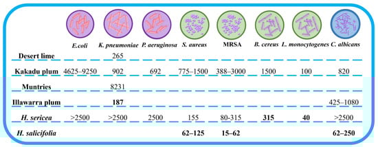 | Hakea sericea (fruit) | S. aureus, Methicillin-resistant S. aureus | 0.31 mg/mL | [131] |