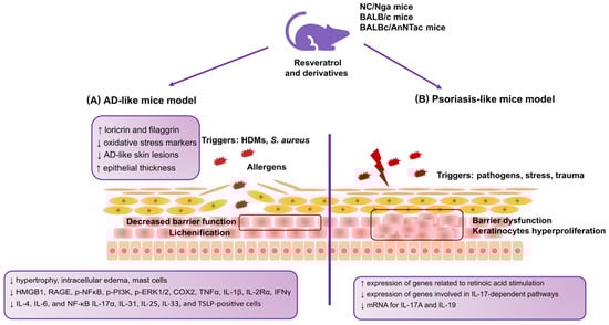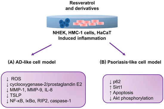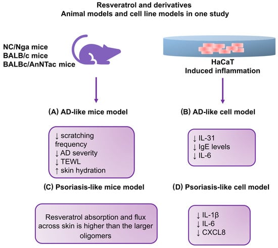 AD and psoriasis are disorders that, in their pathogenesis, show many similarities, ranging from the deregulation of the immune response through genetic determinants to abnormalities in keratinocyte proliferation. As a result, both conditions are characterized by dry, scaly skin. In order to accurately reflect the course of the pathogenesis of these diseases, cellular models are increasingly used [100]. In AD and psoriasis research, in addition to in vitro models, in vivo animal models are used [101,102,103]. Although animal models are widely used for AD and psoriasis research, researchers should be cautious when extrapolating their data to human diseases. This is dictated by the fact that many discrepancies have been noticed between animal models and the course of the disease in humans. Typically, these are differences in inflammatory profiles or the fact that human AD can be divided into several phenotypes and endotypes and distinct types depending on the patients’ age, chronicity, or genetic background, which influences the course of its pathogenesis [101,103]. In the case of psoriasis, it is crucial to be aware that similar hyperproliferative inflammatory phenotypes can result from different manipulations. Therefore, it was concluded that no animal model described so far reflects all aspects of human psoriasis [102]. Figure 1 summarizes the described relationships between resveratrol’s anti-inflammatory and antioxidant effects and its derivatives in developing inflammatory skin disorders.