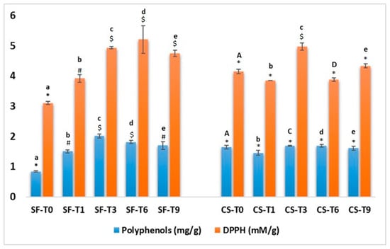 Total polyphenol content and antioxidant activity in Abate Fétel pear peels under different storage conditions, SmartFresh® treatment (SF) and cold storage (CS), harvested at two different times. The results are expressed as means ± standard deviations. Different symbols indicate significant differences between samples of the same storage treatment. Lower- and uppercase letters indicate significant differences for SmartFresh (SF) samples vs. cold storage (CS) samples at the same sampling time (T0, T1, T3, T6, T9) (p ≤ 0.05).