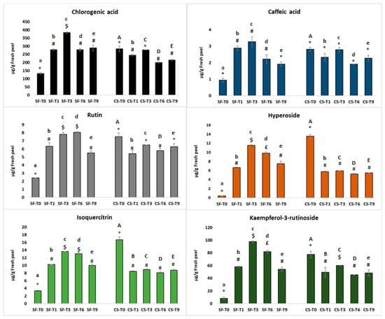 Chlorogenic and caffeic acid, rutin, hyperoside, kaempferol-3-rutinoside and isoquercitrin quantified in Abate Fétel peels harvested at two different points and stored at low temperature and with 1-MCP. The results were expressed as means ± standard deviations (µg/g of fresh matter). Different symbols indicate significant differences between samples of the same storage treatment. Lower- and uppercase letters indicate significant differences for SmartFresh (SF) samples vs. cold storage (CS) samples at the same sampling time (T0, T1, T3, T6, T9) (p ≤ 0.05).