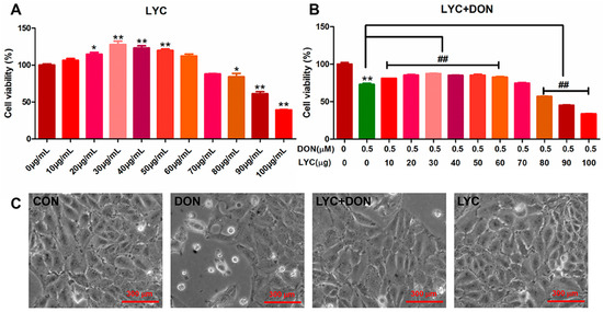 For the DON + LYC experiment, the cells with an initial density of 2 × 104 cells per well were inoculated into a 96-well plate, and then LYC with concentrations of 0, 10, 20, 30, 40, 50, 60, 70, 80, 90, 100 µg/mL was added together with DON to the cells which concentration was based on a previous study [21]. After 24 h of cell culture, CCK-8 was added to each wall for 1 h, and then the Infinite M200 FA plate reader was used to measure cell viability.