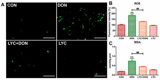 LYC alleviated the oxidative damage of IPEC-J2 cells caused by DON. (A) Images of ROS fluorescence. Scale bar = 500 µm (B) ROS content. (C) MDA content. IPEC-J2 cells were divided into CON, DON, LYC + DON, and LYC groups. Each reported value (n = 3) represents the mean ± SEM. Asterisk (*) for the significance of differences between the control and another, ** p < 0.01: Hashes (#) for the significance of differences between the DON and LYC + DON, ## p < 0.01.