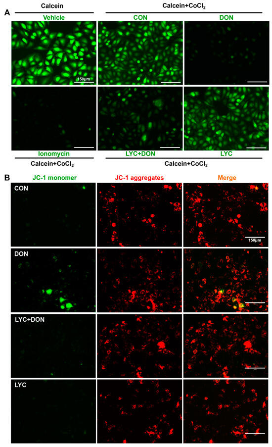 LYC alleviated the DON-induced mitochondrial damage. IPEC-J2 cells were divided into CON, DON, LYC + DON, and LYC groups. (A) Mitochondrial membrane potential (MMP) in IPEC-J2 cells. (B) Mitochondrial permeability transition pore (mPTP) opening in IPEC-J2 cells. Scale bar = 150 µm.