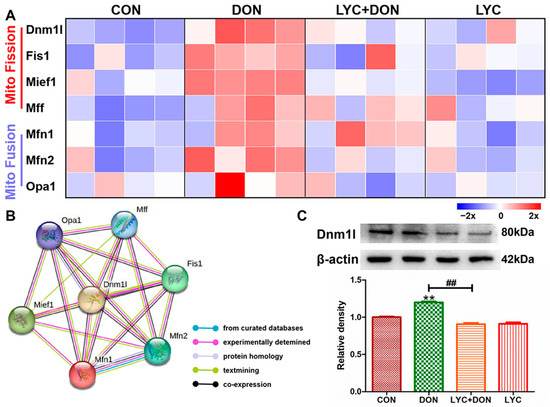 LYC alleviated the mitochondrial dynamics disturbance induced using DON. IPEC-J2 cells were divided into CON, DON, LYC + DON, and LYC groups. (A) The relative RNA abundance of mitochondrial fission-related genes (Dnm1, Fis1, Mief1, Mff) and the relative RNA abundance of mitochondrial fusion-related genes (Mfn1, Mfn2, OPA1). (B) The PPI network of mitochondrial fission and fusion-related genes was constructed using the STRING 10 database. (C) Western blot analysis of Dnm1 protein. Each reported value (n = 3) represents the mean ± SEM. Asterisk (*) for the significance of differences between the control and another, ** p < 0.01: Hashes (#) for the significance of differences between the DON and LYC + DON, ## p < 0.01.