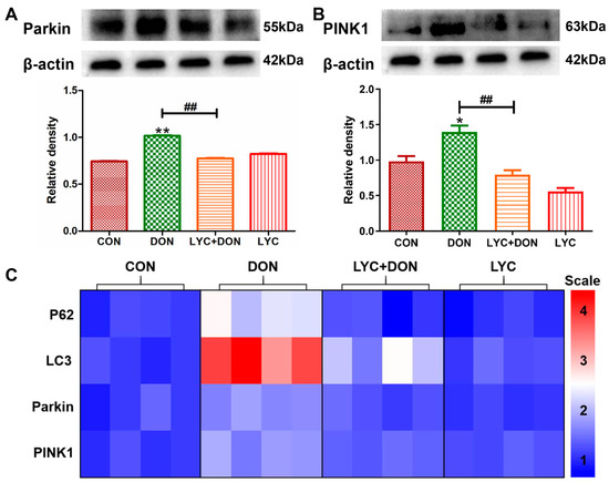 LYC alleviated the mitophagy imbalance induced using DON. IPEC-J2 cells were divided into CON, DON, LYC + DON, and LYC groups. (A) Western blot analysis of Parkin protein. (B) Western blot analysis of PINK1 protein. (C) Relative RNA abundance of mitophagy-associated factors (P62, LC3, Parkin, PINK1). Each reported value (n = 3) represents the mean ± SEM. Asterisk (*) for the significance of differences between the control and another, * p < 0.05, ** p < 0.01: Hashes (#) for the significance of differences between the DON and LYC + DON, ## p < 0.01.