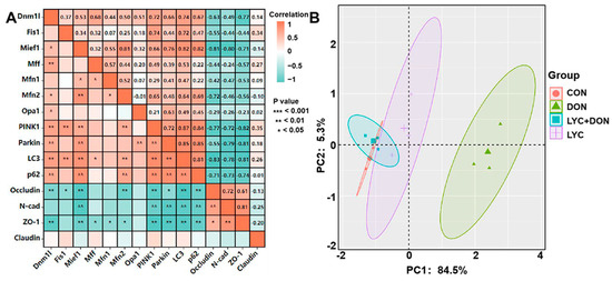 To further illustrate the protective mechanism of LYC on DON-induced IPEC-J2 cell damage, we conducted correlation and PCA analysis on mitochondrial dynamics, mitophagy, and tight junction (TJ) related gene expression (see Figure 7). Pearson’s correlation coefficients showed that there were strongly positive correlations between the mitochondrial dynamics-related factors (Dnm1l and Mief1) and mitophagy-related genes (p < 0.01). On the contrary, mitochondrial dynamics-related factors (Dnm1l and Mief1) and mitophagy-related genes (Parkin, PINK1, LC3, and P62) had a strongly negative correlation with TJ related genes (Occludin, N-cad, and ZO-1) (p < 0.05) (see Figure 7A). In addition, PCA score plot results showed the distance between the CON group and the LYC + DON group. Moreover, there was an overlap among the CON, LYC, and LYC + DON groups (see Figure 7B). Together, these data indicated that LYC alleviated DON-induced IPEC-J2 cell damage via regulating mitochondrial dynamics and mitophagy-related gene expressions.