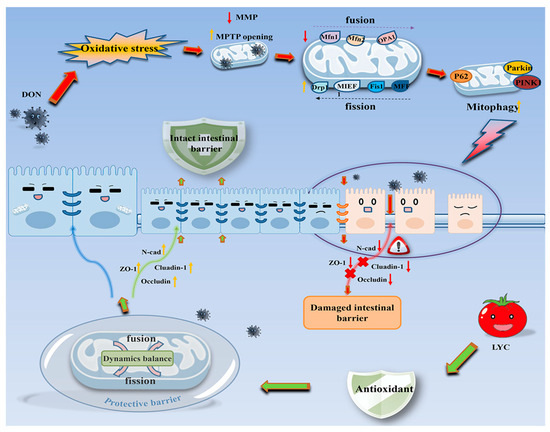 Lycopene (LYC) is a carotenoid that is widely found in tomatoes, papaya, watermelon, pomegranate, pink grapefruit, and other red foods and fruits [17]. Due to the polyunsaturated bond structure of LYC, LYC can alleviate intestinal barrier disorders and maintain intestinal health via its antioxidant and anti-inflammatory properties [18]. LYC can be used as an adjunctive medication in the treatment of colorectal cancer and colon cancer [19]. Current studies found that LYC can reduce mitochondrial damage by maintaining mitochondrial redox balance homeostasis, protecting mitochondrial morphological structure, and regulating mitophagy and mitochondrial quality control system, thus achieving the therapeutic effect and a promising effect on protecting cell function [20]. However, whether LYC can decrease mitochondrial damage and maintain mitochondrial homeostasis to mitigate intestinal toxicity caused by DON is unknown.