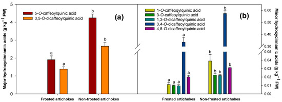 A similar tendency was observed for the minor hydroxycinnamic acids; in general, their concentration was significantly higher in non-frosted artichokes than the frosted ones (Figure 5b). The concentration of 1-O-caffeoqylquinic acid observed, which almost triplicated its content, had values of 0.011 ± 0.002 g kg−1 FW in frosted artichokes and 0.039 ± 0.008 g kg−1 FW in non-frosted ones (Figure 5b). This was the minor hydroxycinnamic acid which showed the highest increment, changing the importance of 1-O-caffeoqylquinic acid in non-frosted artichokes compared to frosted ones.