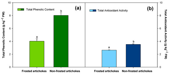 (a) Total phenolic content (g kg−1 FW) and (b) total antioxidant activity (g kg−1 FW) for ‘Blanca de Tudela’ frosted (grades 4 and 5) and non-frosted artichokes (grade 0). Results were expressed as mean values ± SE. Different letters show significant differences (p < 0.05 according to HSD Duncan’s test) between frosted and non-frosted artichokes for total antioxidant activity and total phenolic content.