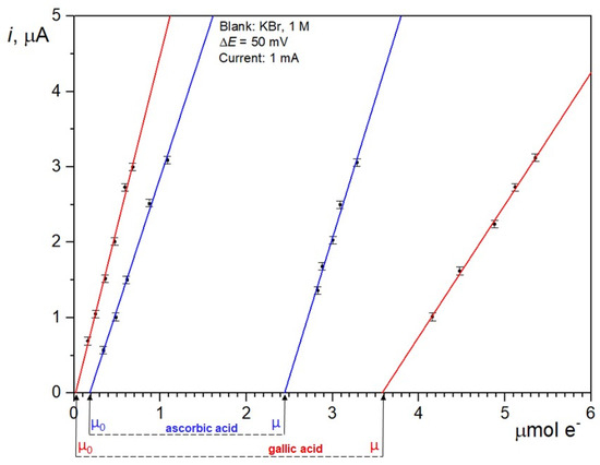 As far as oxidizable species occur in the solution, they are oxidized by Br2 with reactions and mechanisms that remain substantially undefined, while each bromine atom is formally reduced into Br−. When oxidizable species are completely consumed, the simultaneous presence of Br2 and Br− in the solution generates an increasing current i (μA) in a biamperometric circuit held at a constant potential. Excess Br2 is stepwise generated in the solution until a current significantly different from the noise is detected. The end-point is determined on the x-axis (μmol e−) from a i vs. μ plot via linear extrapolation of no less than four i vs. t data points. In this way, a limitation of the approach suggested by Ziyatdinova et al. [26], which is markedly dependent on the accuracy of a single amperometric current measurement, can be overcome.