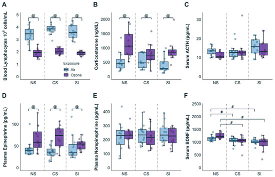 Effect of stressors on physiological responses. (A): Regardless of stress conditions, O3 decreased blood lymphocytes across all stress groups. (B): Corticosterone (CORT) was increased across all stress groups concomitant with the decrease in lymphocytes. (C): ACTH levels at the selected time point were unaltered across all stress and exposure groups. (D,E): Plasma epinephrine was significantly elevated by exposure to O3 with no effect on plasma norepinephrine levels. (F): BDNF plasma levels were significantly decreased by chronic stress and social isolation regardless of exposures. NS = no stress controls; CS = chronic stress group; SI = social isolation group. Data are represented by boxplots with a dot plot overlay to express the distribution of each data point where n = 5–12. @ represents a statistical difference (p < 0.05; see details in the text) between exposure groups within the same stress group. # represents a statistical difference (p < 0.05; see details in the text) between stress groups within the same exposure group.
