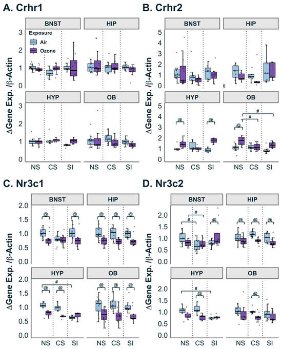 Effect of stressors on genes related to stress receptors. (A): Across all brain regions and stress groups, there was no change in Crhr1 gene expression. (B): Crhr2 expression was altered by O3 exposure in the no stress (NS) and social isolation (SI) group for hypothalamus (HYP) and NS group for olfactory bulb (OB). Also, in the OB, both chronic stress (CS) and SI had diminished responses to O3 exposure. (C): Nr3C1 expression was significantly decreased by O3 exposure across all stress groups in the hippocampus (HIP) and OB. Nr3C1 expression was also decreased in the NS and SI groups in the bed nucleus of the stria terminalis (BNST) and the NS and CS groups in the HYP. In the HYP, expression in the SI group was lower than that in the NS group. (D): Nr3c2 expression was decreased by O3 for all three stress groups in the HIP. A similar decrease was observed in the HYP and OB, but only the CS groups were significantly decreased. In the BNST, O3 exposure in the SI group increased expression of Nr3c2. In the BNST and HYP, CS and S groups had diminished expression compared to NS, respectively. Data are represented by boxplots with a dot plot overlay to express the distribution of each data point where n = 5–12. @ represents a statistical difference (p < 0.05; see details in the text) between exposure groups within the same stress group. # represents a statistical difference (p < 0.05; see details in the text) between stress groups within the same exposure group.
