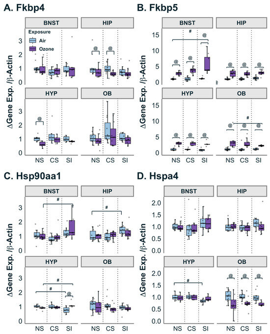 Effect of stressors on genes related to glucocorticoid-associated chaperones. (A): Fkbp4 was significantly altered by exposure to O3 in the hippocampus (HIP) for the no stress (NS) and chronic stress (CS) groups and in the hypothalamus (HYP) for the NS group. (B): Fkbp5 was significantly increased by O3 exposure in all brain regions. Also, the O3-induced increase in Fkbp5 was higher than that in the NS group in the bed nucleus of stria terminalis (BNST) while it was lower in the olfactory bulb (OB). (C): Hsp90aa1 expression was significantly higher in the BNST when exposed to O3 compared to the NS group. In the HYP, the social isolation (SI) group had higher baseline Hsp90aa1 expression in the air group compared to NS. In the HYP, both exposure groups were significantly altered by SI compared to NS. (D): Hspa4 was decreased by O3 exposure in the OB for all three stressor groups. In the HYP, the air-exposed group in SI had lower expression than that of the NS. Data are represented by boxplots with a dot plot overlay to express the distribution of each data point where n = 5–12. @ represents a statistical difference (p < 0.05; see details in the text) between exposure groups within the same stress group. # represents a statistical difference (p < 0.05; see details in the text) between stress groups within the same exposure group.