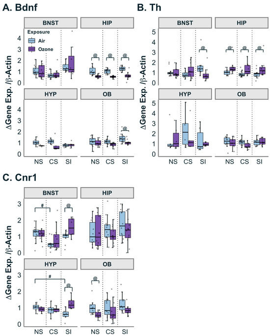 Effect of stressors on genes related to neurotrophic, neurotransmitter and cannabinoid factors. (A): O3 exposure significantly decreased Bdnf expression in the hippocampus (HIP) region for all three stress groups (NS = no stress controls; CS = chronic stress group; SI = social isolation group) and in the SI group in the olfactory bulb (OB). (B): Th expression was increased across all stress groups in response to O3 exposure in the hippocampus (HIP) but decreased in the SI within the bed nucleus of the stria terminalis (BNST). (C): Cnr1 expression was increased by O3 exposure in the SI group within the BNST and hypothalamus (HYP) and decreased by O3 in the NS group within the OB. In the BNST, the baseline air-exposed group in the CS was lower than that of the NS. A lower baseline was also found in the SI of the HYP. Data are represented by boxplots with a dot plot overlay to express the distribution of each datapoint where n = 5–12. @ represents a statistical difference (p < 0.05; see details in the text) between exposure groups within the same stress group. # represents a statistical difference (p < 0.05; see details in the text) between stress groups within the same exposure.