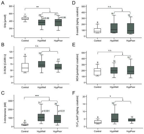 Markers of oxidative stress and antioxidant potential measured in plasma and in urine. (A) Amount of SHp (free thiol groups in proteins) as a marker of antioxidant potential in plasma. (B) Quantification of D-ROM (derivatives of reactive oxygen species) as a marker of lipid oxidation in plasma. (C) Measurement of 3-nitrotyrosine as a marker of nitrosative stress to proteins in plasma. (D) Detection of the oxidative DNA base-pair modification 8-oxodG excreted in urine. Quantification of (E) MDA (malondialdehyde) and (F) 15-F2t-IsoP (15-F2t-isoprostane) as markers of lipid peroxidation in urine. Shown in each case is the comparison between the control group, HypWell, and HypPoor, with the p values inserted next to the standard deviation bar. The brackets indicate the comparison of HypAll to the control. n.s. = nonsignificant, * p ≤ 0.05, ** p < 0.01, and *** p < 0.001. Numbers over the boxplots indicate the number of patient samples analyzed.