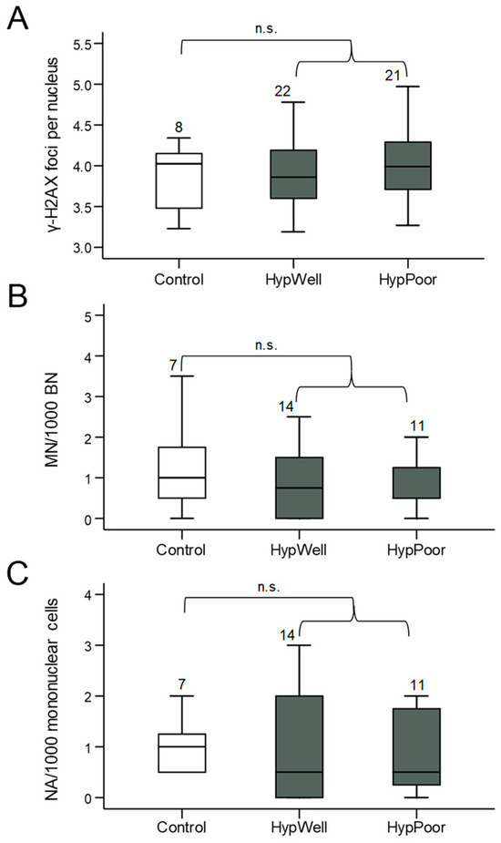 Markers for DNA damage in lymphocytes. (A) γ-H2AX foci/nucleus, (B) micronuclei/1000 mononuclear cells, and (C) nuclear anomalies (NA)/1000 mononuclear cells in lymphocytes isolated from the participants’ blood samples. Shown in each case is the comparison between the control group, HypWell, and HypPoor. The brackets indicate the comparison of HypAll to control. n.s. = nonsignificant. Numbers over the boxplots indicate the number of samples analyzed.