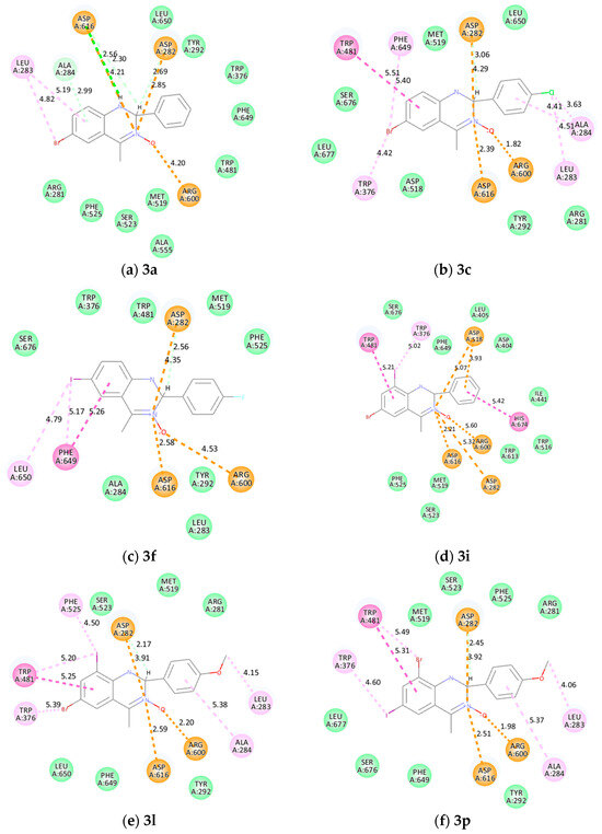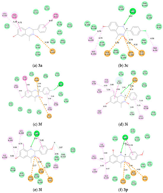 Molecular docking of compounds (a) 3a, (b) 3c, (c) 3f, (d) 3i, (e) 3l and (f) 3p into α-glucosidase. Interaction types are marked with dashed lines and are color-coded as follows: bright green: conventional hydrogen bond; lighter green: van der Waals interaction; very light green: carbon–hydrogen bond; orange: a salt bridge or attractive charge or pi-anion; bright pink: π-π T-shaped; light pink: alkyl or π-alkyl.