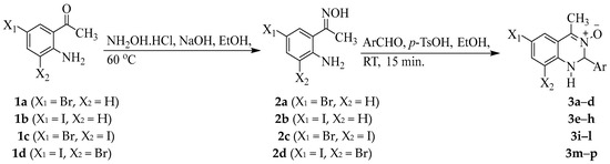 The 2-aryl-4-methyl-1,2-dihydroquinazoline 3-oxides were prepared in two steps following a method previously employed for the synthesis of the A-ring unsubstituted analogues [31], as shown in Scheme 1. The designation of substituents and percentage yields of the isolated products are represented in Table 1. Oximation of the halogenated 2-aminoacetophenones 1a–d was achieved with hydroxylamine hydrochloride under basic conditions in ethanol at 60 °C to afford derivatives 2a–d. The 1H-NMR spectra of these oxime derivatives revealed the presence of a singlet around δ = 6.00 ppm, which corresponds to the hydroxyl proton. These oximes were, in turn, condensed with various benzaldehyde derivatives in the presence of p-toluenesulfonic acid (p-TsOH) in ethanol at room temperature (RT) to furnish products characterized using a combination of spectroscopic (NMR, IR and HR-MS) techniques as the corresponding 2-aryl-4-methyl-1,2-dihydroquinazoline 3-oxides 3a–p. The proton NMR spectra of these compounds revealed the presence of a set of signals in the region δ 5.18–5.62 ppm (br s) and δ 5.78–6.38 ppm for the amine (NH) and methine (-CH-) protons, respectively. Only the resonance for the methine proton of the 6-bromo-8-iodo-substituted derivatives 3i–l resonated as a doublet around δ = 6.22 ppm with coupling constant value, J = 3.5 Hz. The resonance of the methine proton for the other analogues showed the effects of quadrupole broadening due to interaction with the nitrogen atom. This effect usually reduces the accuracy in the measurement of the spin–spin coupling constants of the protons in direct proximity to the nitrogen [32]. Their proton and carbon-13 NMR spectra revealed the presence of an increased number of aromatic proton and carbon signals consistent with the assigned structures. The π-type O–N back-donation is known to increase electronic density at its neighboring carbon atoms. The carbon-13 NMR signal of the methine carbon (C-2) and C-4 resonated around δ = 79.3 ppm and 140.0 ppm, respectively. The stereochemical understanding of the compounds results in important data regarding the most stable conformer of equilibrium, which in turn is the most likely structure exhibiting biological activity in vivo [33]. The lack of heteronuclear and/or vicinal 3JHH scalar coupling constants for the test compounds made it difficult to easily determine the conformation of the heterocyclic ring in the solution phase by means of NMR spectrometric techniques. Moreover, NMR spectrometric data cannot easily distinguish between an N-O inner ring and an N-O coordination bond in the structure. Single-crystal X-ray diffraction (XRD) has established itself as the most accurate method to determine the structure of N-oxides and their conformation even more so. Knowledge of conformational preference in the solid state, on the other hand, is very important in drug design and the pharmaceutical industry, as a crystal structure is directly related to the bioavailability of a drug molecule [34]. Moreover, it has been proven that the conformation of medium-sized molecules in solution resembles their solid-state conformation [35].