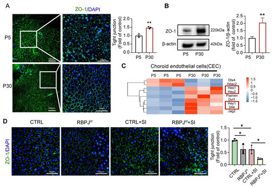 Notch signaling in CECs regulates the RPE barrier formation and the disruption induced by sodium iodate. (A) Whole-mount choroidal staining with ZO-1 in 5-day-old and 30-dayold mice. The number of RPEs with intact tight junctions was quantitatively compared. Scale bars: 100 µm, 50 µm. (B) Protein expression level of ZO-1 in choroidal issue of P5 and P30 mice was tested via Western blot. (C) A heat map of differential gene expression in the CECs of P5 and P30 mice. Each row in the heat map represents a differential gene, each column represents a sample, and the color represents the expression level. Blue to red corresponds to the expression level, from low to high. (The red box are genes associated with the Notch signal) (D) Whole-mount choroidal staining of EC-specific Notch signaling deletion mice CDH5-CRE-RBPJf/f (RBPJf/f) or control (RBPJf/+) mice at p30, treated with or without SI, were analyzed using ZO-1 staining. The number of RPEs with intact tight junctions was quantitatively compared. Scale bars: 50 µm. * p < 0.05, ** p < 0.01. Three biological replicates were performed and values presented as the mean ± SEM (n = 3). * p < 0.05, ** p < 0.01.