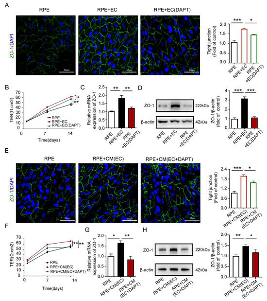 To further confirm the specific regulation of endothelium Notch signaling on RPE barrier function in vitro, we established a non-contact coculture model with ECs and ARPE-19 cells. For the cell model, the ECs and ARPE-19 cells were seeded in two different compartments; the ARPE-19 cells were seeded into insert membranes and the ECs were seeded into wells, and cells could indirectly communicate through the pores of the membrane. The transepithelial electrical resistance (TER) value and tight-junction protein ZO-1 expression can be used to assess the RPE barrier function. We cultured the RPE cells on polyester transwell inserts until full confluence and transferred them to new cell culture chambers along with ECs or conditioned media. We used HUVECs and primary CECs for coculture experiments and found that both ECs had no significantly different effects on RPE (Supplementary Figure S1). Therefore, we executed coculture experiments using HUVECs. The RPE cells improve tight junction morphology, as seen in the ZO-1 fluorescence staining (Figure 2A), and exhibit higher TER values in the presence of ECs (Figure 2B). Additionally, the expression of ZO-1 in RPE cells upregulated the mRNA and protein levels (Figure 2C,D). However, both the TER values and the ZO-1 expression of the RPE decreased significantly with DATP treatment to inhibit Notch signaling in the ECs. Furthermore, we observed similar results by using an EC-conditioned medium for RPE cell culture (Figure 2E–H). Overall, these findings confirm, in vitro, that coculture with ECs can effectively promote the formation of the RPE barrier through angiocrine function, and this effect is attenuated when endothelial Notch signaling is blocked.