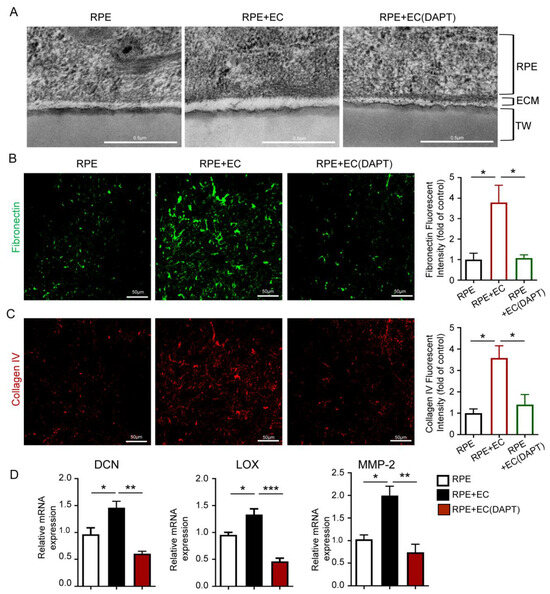 It has been reported that the extracellular matrix (ECM) can regulate the function of the RPE barrier [19]. Therefore, we sought to explore whether inhibiting endothelial Notch signaling affects the deposition of ECM in polarized RPE cells. The transmission electron microscopy analysis demonstrates a relatively thin layer of ECM under the polarized RPE cells when the RPE barrier formed. Using the coculture system, we found that the ECM layer is more abundant in the presence of ECs (Figure 3A). Immunofluorescence analyses of the transwell inserts’ membrane show an increased expression of fibronectin and collagen IV proteins in the presence of ECs (Figure 3B,C). RT-qPCR analysis of the RPE cells reveals an upregulation of ECM-related genes, including decorin (DCN), lysyl oxidase (LOX), and MMP-2, in the presence of ECs (Figure 3D). However, when inhibiting the Notch signaling in HUVECs via the DATP treatment, the ECM layer, fibronectin, and collagen IV proteins’ expression, the ECM-related gene’s expression exhibited a similar level to that of the absence of ECs (Figure 3A–C). These results suggest that ECs can promote the deposition of ECM occurring in the RPE barrier through angiocrine regulation via Notch signaling.