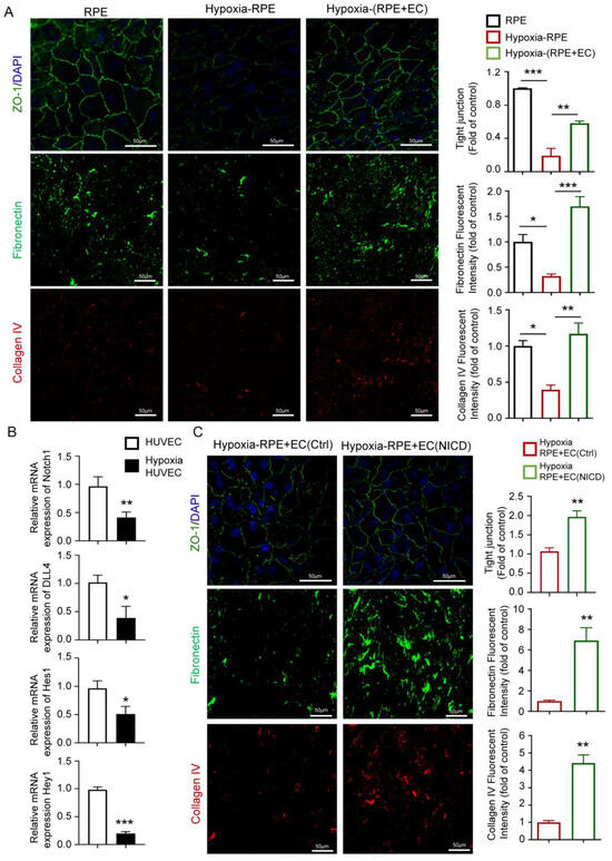 Hypoxia is one of the common factors inducing RPE barrier dysfunction. It is implicated in the development of retinal degenerations such as retinitis pigmentosa (RP), age-related macular degeneration (AMD), and diabetic retinopathy (DR) [32]. In this study, the culture of RPE cells with HUVECs under hypoxic conditions confirms that hypoxia severely damages the functioning of the RPE barrier, which is evident from the significant decrease in the tight junction of RPE and the expression of ECM-related proteins, collagen IV and fibronectin (Figure 4A). However, we also noticed that ECs partially rescue the RPE barrier dysfunction induced by hypoxia (Figure 4A). Interestingly, RT-qPCR reveals that the Notch signaling-related genes (Notch1, Dll4, Hey1, and Hes1) are downregulated in HUVECs when cultured under hypoxic conditions (Figure 4B). Based on this observation, the activation of Notch signaling in HUVECs must enhance the protective role of ECs on the RPE barrier under hypoxic conditions. Using NICD adenovirus infection on the HUVECs, we continuously activated Notch signaling in ECs and the ECs cocultured with RPE under hypoxic conditions. Notch signaling prompts ECs to improve the RPE barrier function by upregulating the expression of the tight junction protein ZO1 and ECM-related proteins, collagen IV and fibronectin, in RPE cells compared with the control group (Figure 4C). Furthermore, to illustrate the role of activated endothelial Notch signaling in the in vivo model, we used an EC-specific NICD-overexpressing mouse CDH5-CRE-NICD and established a laser-induced CNV model. Compared to control mice, whole-mount staining with IB4 shows that the NICD-overexpressing mice exhibit reduced CNV injury and upregulate the expression of the ECM-related genes collagen IV and lysyl oxidase (LOX) (Supplementary Figure S2). These findings reveal that EC can alleviate the RPE barrier dysfunction caused by hypoxia through secreted factors, and Notch signaling activation enhances this protective effect.