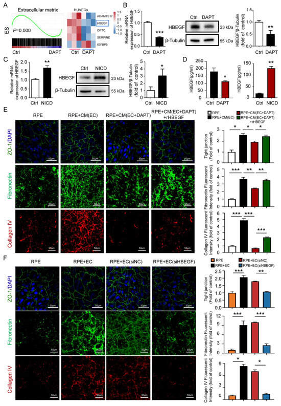 To determine the critical paracrine factors of ECs that might regulate the RPE barrier, we next reanalyzed previously published transcriptome sequencing data of HUVECs treated with DAPT. The gene set enrichment analyses revealed a lower enrichment of ECM-related genes in the group of ECs for which Notch signaling is blocked (Figure 5A). Specifically, the paracrine factor HBEGF significantly decreases when Notch signaling is blocked in ECs (Figure 5A). We then confirmed the sequencing data at the transcriptional and translational levels. Both mRNA expression levels and HBEGF protein secretory levels are down-regulated in Notch signaling-deficient ECs (Figure 5B,D). Accordingly, when Notch signaling is activated constructively in ECs, the HBEGF expression increased (Figure 5C,D). To further investigate whether HBEGF functions in the endothelium Notch blockade induced the RPE barrier function disruption, we added recombinant HBEGF (r-HBEGF) protein into EC-conditioned medium. The tight junction of RPE (stained with ZO-1) and the deposits of collagen IV and fibronectin outside the RPE significantly increased after the addition of recombinant protein HBEGF compared to the Notch signaling-deficient EC-conditioned medium with the control group (Figure 5E). Conversely, the si-HBEGF-treated HUVECs-conditioned medium attenuates the protective function of the ECs on the RPE barrier (Figure 5F). These results indicate that endothelial Notch signaling affects RPE barrier function by regulating the HBEGF paracrine signaling of ECs.