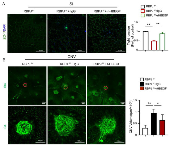 r-HBEGF improved the RPE barrier dysfunction of Notch signaling deletion mice. (A) In the SI-induced RPE barrier disfunction model, whole-mount choroidal staining for EC-specific Notch signaling deletion mice CDH5-CRE-RBPJf/f intravitreally injected with IgG or r-HBEGF, and control mice (RBPJf/+) at p30, were analyzed using ZO-1 staining. The number of RPE cells with intact tight junctions were quantitatively compared. Red circles indicate the location of the optic disk. Scale bars: 50 µm. (B) In the laser-induced CNV model, whole-mount choroidal staining for EC-specific Notch signaling deletion mice CDH5-CRE-RBPJf/f intravitreally injected with IgG or r-HBEGF and control mice (RBPJf/+) were analyzed using IB-4 staining. IB4 positive areas were quantitatively compared. Three biological replicates were performed and values are presented as the mean ± SEM (n = 3). Scale bars: 150 µm. * p < 0.05, ** p < 0.01.
