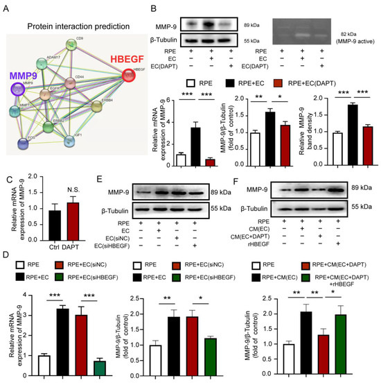 EC regulates MMP-9 expression in RPE cells via Endothelial Notch signaling-driven HBEGF secretion. (A) Protein interaction prediction analysis results of HBEGF and MMP-9, using the String database. (B) mRNA level, protein level, and enzyme activity level of MMP-9 in the RPE, RPE with HUVEC, and RPE with Notch signaling-inhibited HUVECs were tested via qRT-PCR, Western blot, and gelatin assay kit. (C) mRNA levels of MMP-9 in normal HUVECs and DAPT-treated HUVECs were tested via qRT-PCR. (D,E) mRNA and protein levels of MMP-9 in the RPE, RPE with HUVECs, RPE with siNC-treated HUVECs, and RPE with siHBEGF-treated HUVECs were tested via qRT-PCR and Western blot. (F) Protein levels of MMP-9 in RPE cells cultured in normal medium, RPE cultured in EC-conditioned medium, RPE cultured in Notch signaling-inhibited EC-conditioned medium, and RPE cultured in Notch signaling-inhibited EC-conditioned medium supplemented with recombinant HBEGF (r-HBEGF) were tested using Western blot. Three biological replicates were performed and values are presented as the mean ± SEM (n = 3). NS, no significance, * p < 0.05, ** p < 0.01, *** p < 0.001.