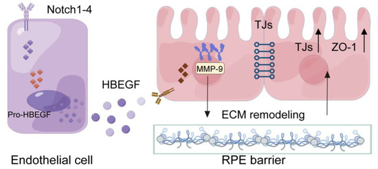 In conclusion, this study supports a novel mechanism of EC-RPE crosstalk in regulating the outer blood–retinal barrier (oBRB) function. Endothelial Notch signaling regulates choroid angiocrine signaling, while RPE cells sense the stimulation of the secretory factor HBEGF. This leads to an up-regulation of MMP-9 expression and activity, initiating extracellular matrix (ECM) remodeling, enhancing the tight junctions between RPE cells, and ultimately protecting the function of the oBRB. This study only briefly explored the interactions between HBEGF and MMP-9. Further investigations are needed to examine the protein binding sites and activation mechanisms of HBEGF and MMP-9 in depth. These results expand our understanding of the role of endothelial Notch signaling in tissue-specific endothelial angiocrine regulation. They imply that modulating Notch signaling in the choroidal endothelium may provide a novel therapeutic strategy in retinal degeneration diseases.