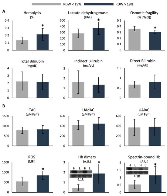 Differences in (A) hemolysis markers and (B) redox parameters between SCD samples stratified by their RDW values. Inserts: immunoblots of selected samples for high (H) and low (L) RDW subgroups. The 4.1R protein was used as an internal loading control. TAC: total antioxidant capacity; UAdAC: uric-acid-dependent antioxidant capacity; UAiAC: uric-acid-independent antioxidant capacity; ROS: reactive oxygen species; MFI: mean fluorescence intensity; Hb: hemoglobin. (*) p < 0.05.