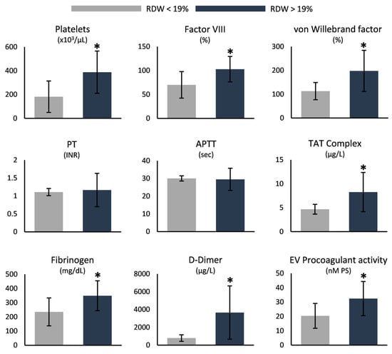 Differences in hemostasis and coagulation parameters between SCD samples stratified by their RDW values. PT: prothrombin time; INR: international normalized ratio; APTT: activated partial thromboplastin time; TAT: thrombin–antithrombin; EV: extracellular vesicles; PS: phosphatidylserine. (*) p < 0.05.