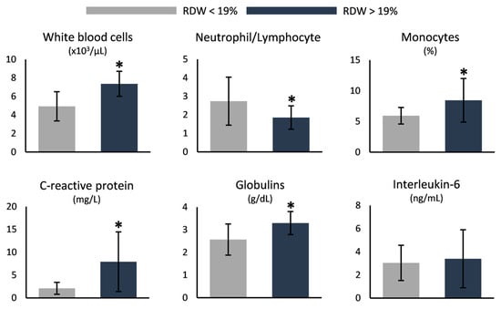 The white blood cell count was higher in the group with increased RDW, with monocytes following the same pattern but the neutrophil to lymphocyte ratio being inferior compared to the lower-RDW group (Figure 4). In the same context, markers of inflammation, like C-reactive protein and globulins, were elevated in the group of RDW > 19%, even though interleukin-6 was unaffected (Figure 4). Finally, the levels of serum albumin were lower in the same group (4.7 ± 0.3 vs. 4.3 ± 0.3 g/dL, lower RDW vs. higher RDW, p = 0.003).