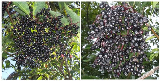 - Lee, J.; Finn, C.E. Anthocyanins and Other Polyphenolics in American Elderberry (Sambucus canadensis) and European Elderberry (S. nigra) Cultivars: Anthocyanins in American and European Elderberry Cultivars. J. Sci. Food Agric. 2007, 87, 2665–2675. [Google Scholar] [CrossRef] [PubMed]