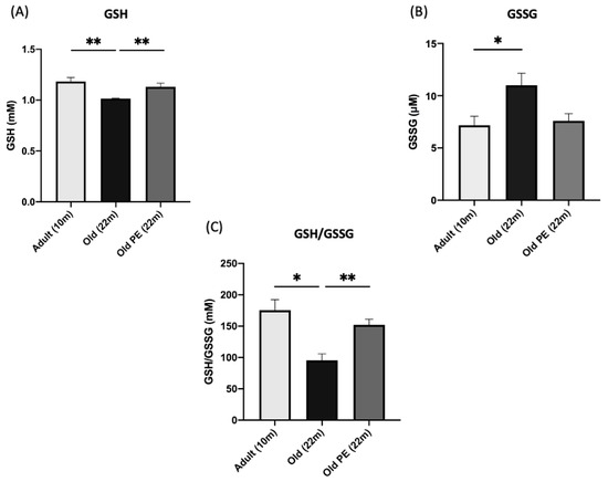 Effect of PE administration on glutathione redox status in mice’s blood. The figure shows (A) GSH, (B) GSSG, and (C) GSH/GSSG levels in blood in mice after 18 months, 22 months, and 22 months of supplementation with PE. Results are expressed as mean ± SEM (n = 5–6 per group). * p < 0.05, ** p < 0.01.