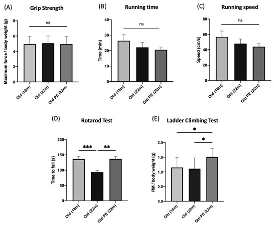 Effect of PE supplementation on functional studies. (A) Maximum force on the grip strength test; (B) Running time on treadmill; (C) Running speed on treadmill; (D) Motor coordination on the rotarod test; (E) Sensory motor evaluation on the ladder-climbing test. Results are expressed as mean ± SD (n = 8–9 per group). * p < 0.05, ** p < 0.01 and *** p < 0.005. (ns: not significant).
