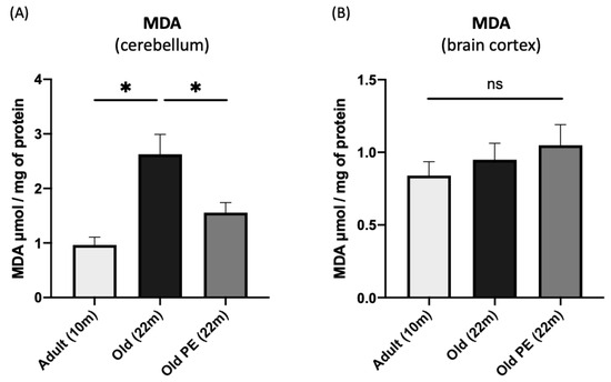Effect of PE on lipid peroxidation. MDA levels (µmol/mg protein) were measured by HPLC in cerebellum homogenates (A) and in brain cortex homogenates (B) of mice at 10 and 22 months of age. Results are expressed as mean ± SEM (n = 4–7 per group). * p < 0.05. (ns: not significant).