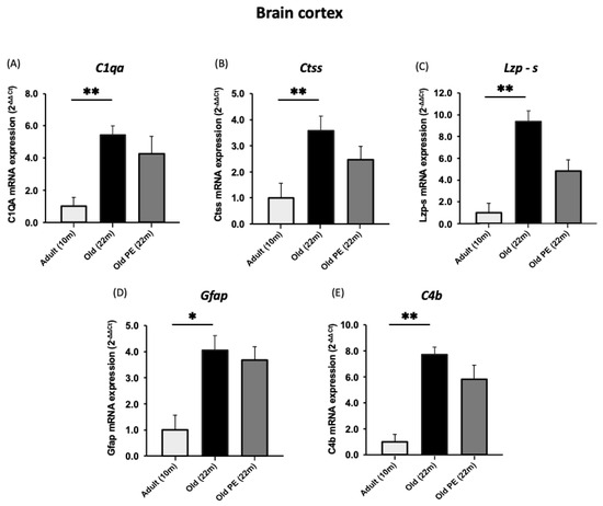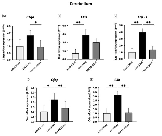 The effect of PE supplementation on the expression of aging biomarkers in cerebellum. (A) C1qa, (B) Ctss, (C) Lzp-s, (D) Gfap, (E) C4b. Results are expressed as mean ± SEM (n = 7–10 per group). * p < 0.05, ** p < 0.01.