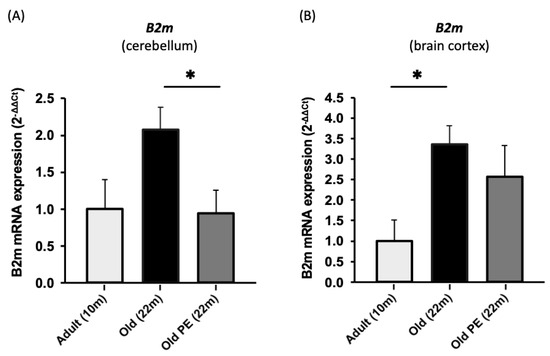The effect of PE supplementation on the expression of B2m in cerebellum (A) and brain cortex (B). Results are expressed as mean ± SEM (n = 5–6 per group). * p < 0.05.