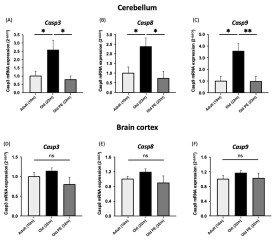 The effect of PE supplementation on the expression of apoptosis biomarkers in cerebellum and cortex. (A) Casp3, (B) Casp8, and (C) Casp9 in cerebellum and (D) Casp3, (E) Casp8, and (F) Casp9 in cortex. Results are expressed as mean ± SEM (n = 6–8 per group). * p < 0.05, ** p < 0.01. (ns: not significant).