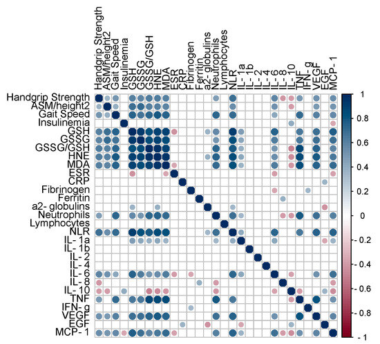 Pearson’s correlation matrix for indexes of muscle function/mass/performance, insulinemia, circulating markers of redox balance, and markers of systemic inflammation/immune response. Only significant (p value < 0.05) correlations are represented with full circles. Positive correlations (0 < r < 1.0) are displayed in blue color, and negative correlations (−1.0 < r < 0) are displayed in red color. Color intensity is proportional to the correlation coefficients. Abbreviations: GSH, reduced glutathione; GSSG, oxidized glutathione; HNE, hydroxynonenal–protein adducts; MDA, malondialdehyde–protein adducts; ESR, erythrocyte sedimentation rate; CRP, C-reactive protein; NLR, neutrophil-to-lymphocyte ratio; IL, interleukin; TNF, tumor necrosis factor; IFN, interferon; VEGF, vascular endothelial growth factor; EGF, epidermal growth factor; MCP-1, monocyte chemoattractant protein-1.