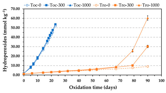 Influence of the phosphatidylcholine (PC) concentration on the formation of hydroperoxides during the oxidation at 50 °C of stripped sunflower oil containing 1.16 mmol kg−1 α-tocopherol (500 mg kg−1) or Trolox (290 mg kg−1). Toc and Tro in the sample codes represent α-tocopherol and Trolox, respectively, and the number after the hyphen indicates the PC concentration expressed in mg kg−1. Data represent means and standard deviations (n = 3). Some of the error bars are within data points.