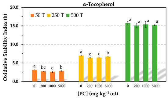 Influence of the phosphatidylcholine (PC) concentration on the oxidative stability index determined in the Rancimat test at 100 °C in stripped sunflower oil containing 50 (50 T), 250 (250 T), or 500 (500 T) mg kg−1 α-tocopherol. Data represent means and standard deviations (n = 3). For a given antioxidant concentration, different letters indicate significant differences according to Duncan’s test (p < 0.05).