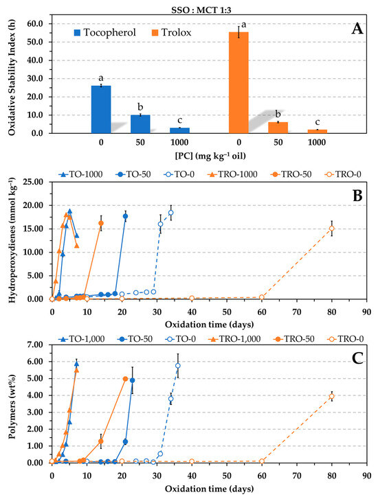Influence of the phosphatidylcholine (PC) concentration on the antioxidant efficacy of α-tocopherol and Trolox at reduced concentration (0.06 mmol kg−1) in a blend of SSO and MCT (1:3, w/w). Oxidative stability index determined in the Rancimat test at 100 °C (A). Formation of hydroperoxides (B) and polymers (C) at 60 °C in an oven. Data represent means and standard deviations (n = 3). For a given antioxidant, different letters in (A) indicate significant differences according to Duncan’s test (p < 0.05). Some of the error bars in (B,C) are within data points.