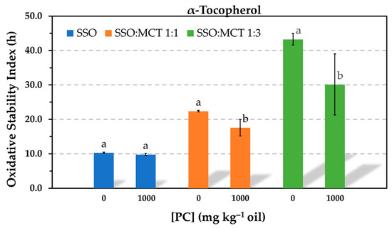 Influence of the addition of 1000 mg kg−1phosphatidylcholine (PC) on the antioxidant efficacy of 1.16 mmol kg−1 α-tocopherol in stripped sunflower oil (SSO), and 1:1 (w/w) and 1:3 (w/w) blends of SSO with MCT, as determined by the Rancimat test at 100 °C. Data represent means (n = 3) and standard deviations. For a given lipid medium, different letters indicate significant differences according to Student’s t-test (p < 0.05).